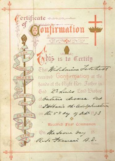 Confirmation Certificate of Wilhelmina Fitchett St. Alban’s October 5, 1893 |