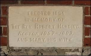 Tablet on the Side of the Church ERECTED 1894 IN MEMORY OF THE REV. ROBERT HARDING RECTOR 1857-1883, AND MARY, HIS WIFE |